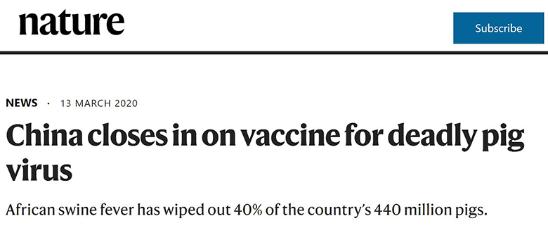 “A vaccine is desperately needed for the resumption of pig production in China,” says Bu Zhigao, a virologist at Harbin Veterinary Research Institute in China. Bu co-authored a paper on the experimental vaccine that was published earlier this month in Science China Life Sciences1.