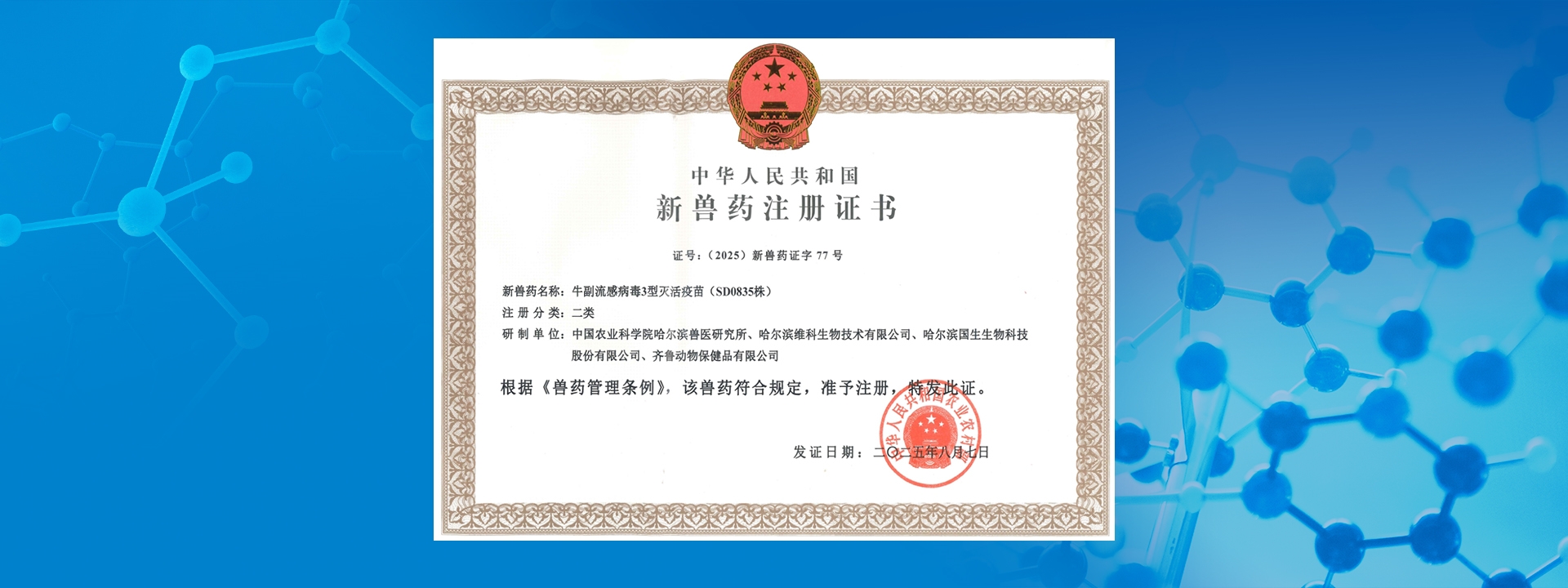 哈兽研成功研制牛副流感灭活疫苗