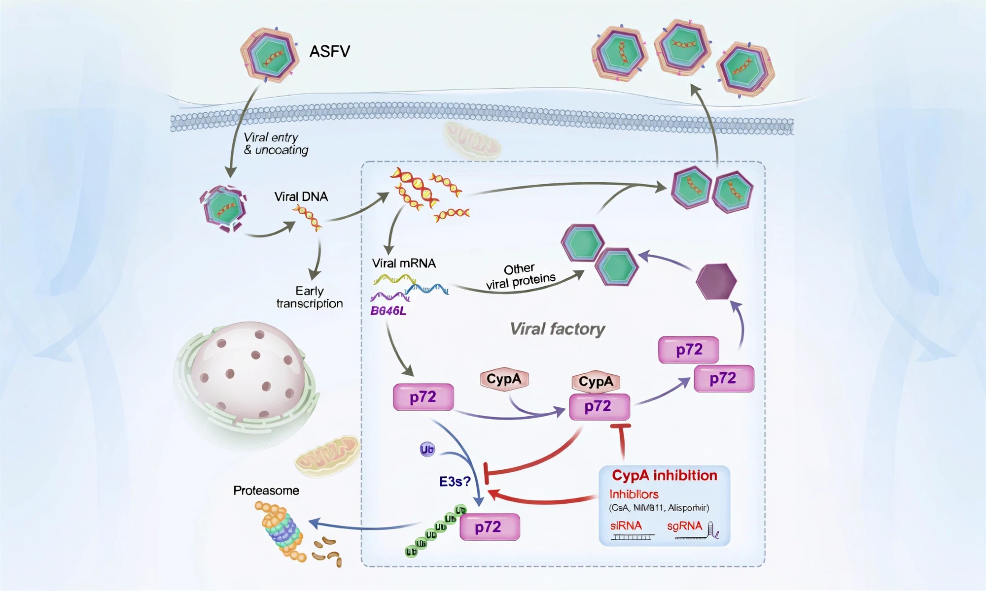 Hui Kong #, Liqin Yang #, Zhenjiang Zhang, Ying Zhang, Linlin Liu, Wan Wang, Linfei Song, Yuanmao Zhu, Encheng Sun, Fang Li, Zhigao Bu, Xiangpeng Sheng, Dongming Zhao. Cyclophilin A stabilizes the capsid protein p72 to facilitate African swine fever virus replication .