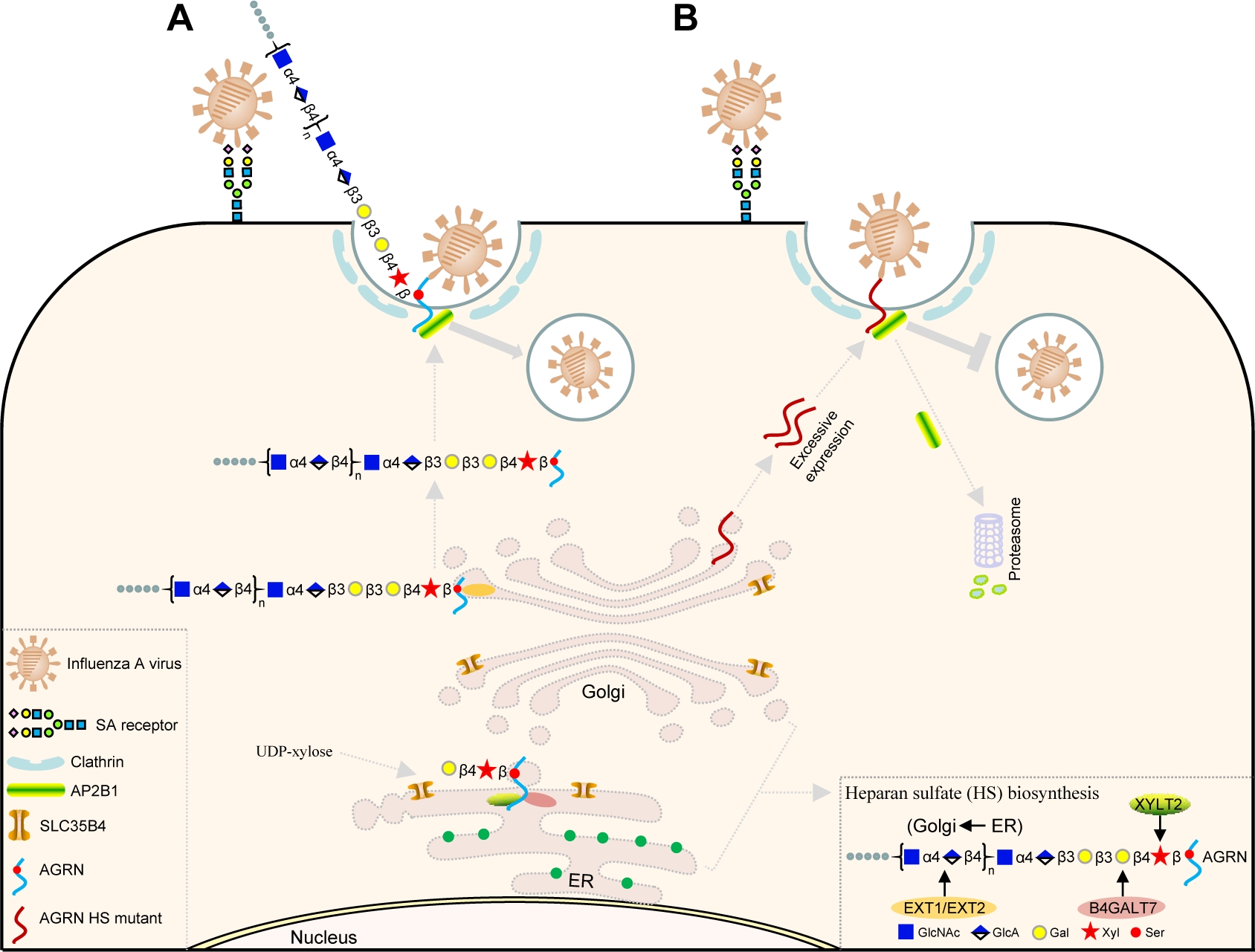 该研究发现,体外下调或缺失SLC35B4表达后能够抑制不同亚型流感病毒复制;同时,在小鼠体内干扰下调SLC35B4表达后能够使60%的小鼠抵御WSN(H1N1)病毒的致死性攻击。机制解析时发现,核苷酸糖转运蛋白SLC35B4将UDP-Xylose由细胞质转运至内质网中,XYLT2催化UDP-Xylose偶联到硫酸乙酰肝素修饰蛋白AGRN的丝氨酸残基上,随后B4GALT7-EXT1/EXT2等催化硫酸乙酰肝素链延长,最终硫酸乙酰肝素修饰蛋白AGRN被转运至细胞膜,辅助流感病毒招募下游分子入侵宿主细胞。硫酸乙酰肝素修饰蛋白AGRN与流感病毒囊膜蛋白血凝素(HA)的HA1亚基互作,进而招募AP2B1启动内化过程;当SLC35B4蛋白缺失后使得未被硫酸乙酰肝素修饰的AGRN过量累积,导致AP2B1经泛素蛋白酶体途径降解,从而抑制流感病毒的内化过程。该研究最终阐明SLC35B4-XYLT2-B4GALT7-EXT1-EXT2-AGRN-AP2B1信号轴介导流感病毒内化过程的分子机制。