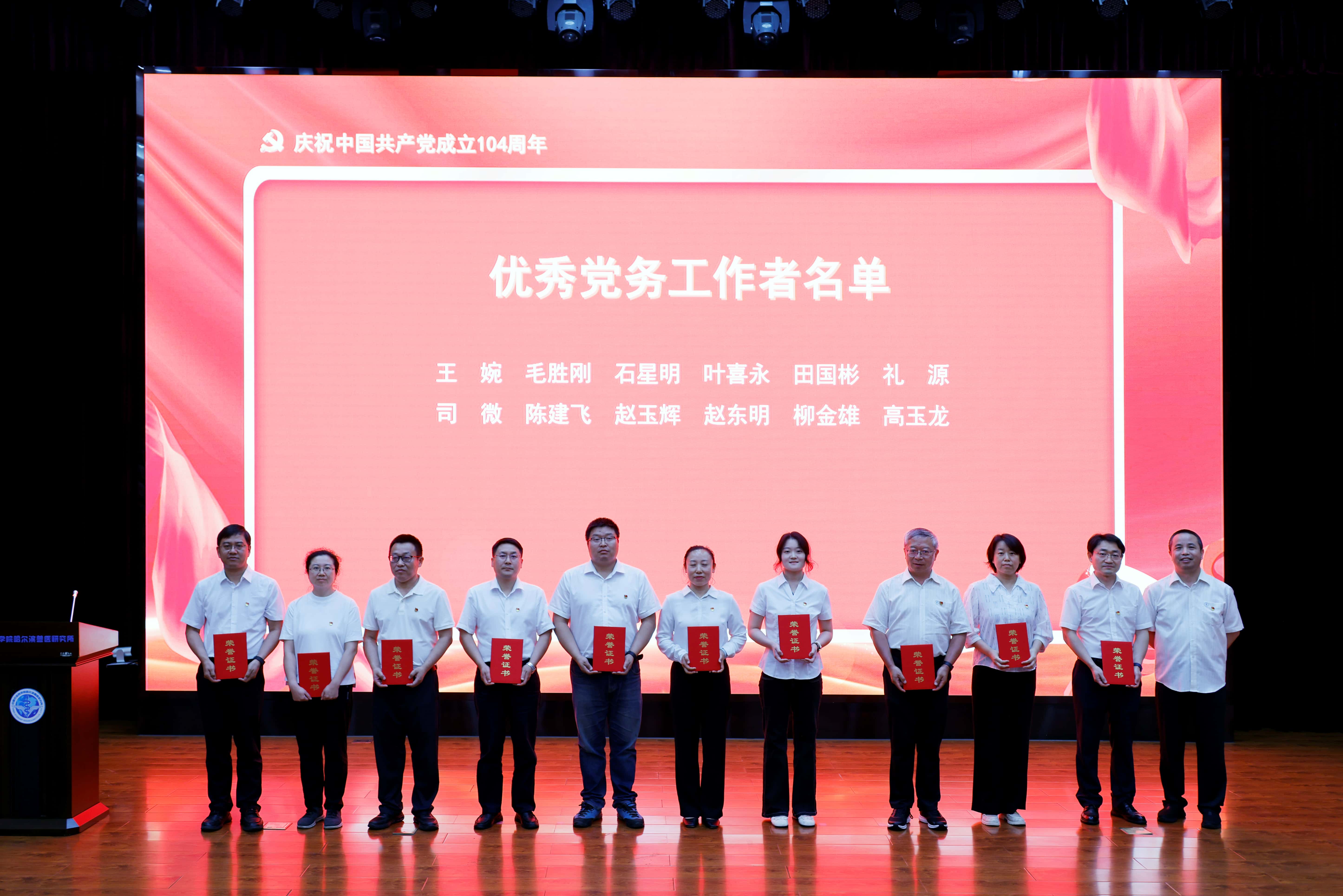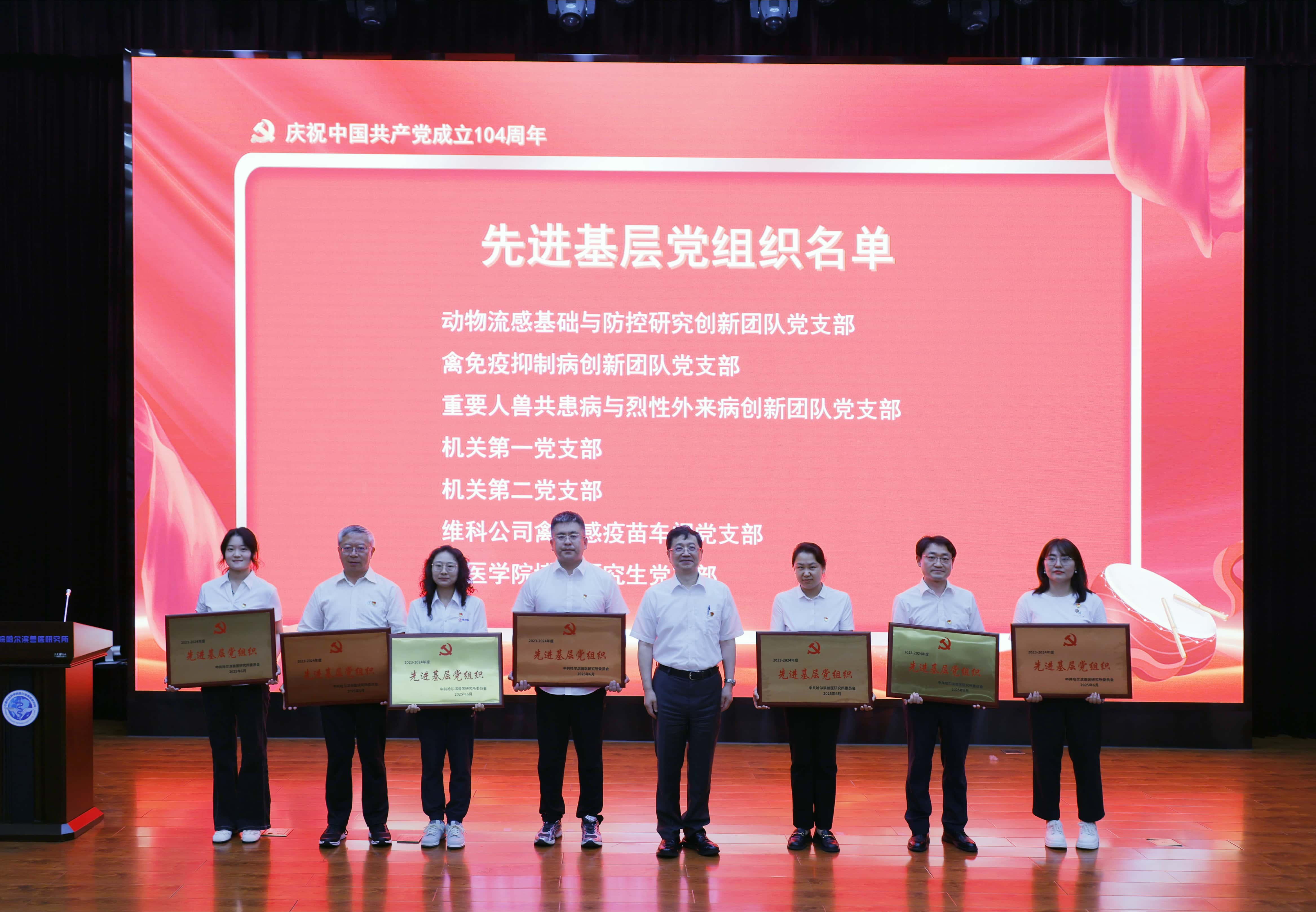 7月1日,中国农业科学院哈尔滨兽医研究所党委举办庆祝中国共产党成立104周年主题活动,表彰2023-2024年度涌现出来的先进集体和个人,举行新党员宣誓和重温入党誓词活动,所长、党委副书记步志高作学习教育专题党课。所领导刘胜旺、孙百明、王晓钧、李呈军和全体党员干部400余人参加会议,纪委书记周亮主持会议。